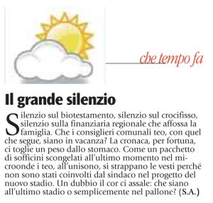 Domenica un corsivo su Bologna 7 (inserto di Avvenire) se la prende con quei consiglieri comunali cattolici che tacciono “sul biotestamento, sul crocifisso e sulla finanziaria regionale che affossa la famiglia” e poi invece “si strappano le vesti perché non sono stati coinvolti dal sindaco nel progetto del nuovo stadio”. Siccome io ho espresso il mio pensiero con grande chiarezza sul biotestamento in Commissione consiliare e non vedo come la mia frase sullo stadio possa essere classificata alla voce “stracciarsi le vesti”, potrei cavarmela dicendo che il corsivo non si riferisce a me. Ma siccome amo la verità più della comodità, riconosco che è rivolto anche a me.